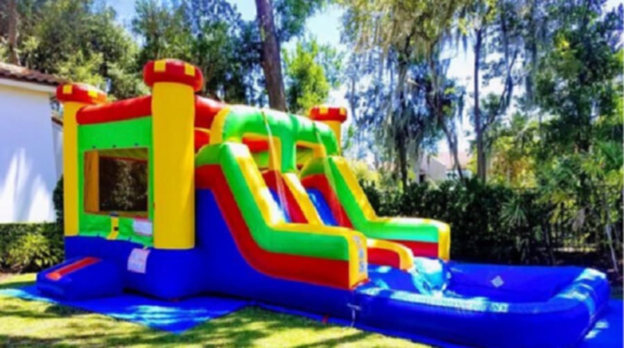 Let the fun begin with... side-by-side slide into one of the widest inflatable pools ever put on a bounce house combo. This COLOSSAL wet and dry combo will bring a blast to your event. Everyone can enjoy it, kids and adults. Sit around the wide, shallow pool with your feet in while the kids have a blast. Great for all sizes, especially large events.