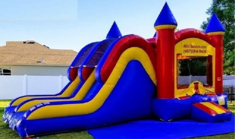 This COLOSSAL 18ft wide bounce house dual 14ft slides. It brings out the competitive nature of Spartans of all ages for a dueling slide race. This AMAZING bounce house and dual slide combo will bring excitement to your event.
