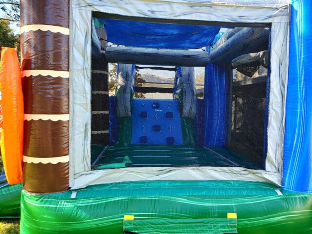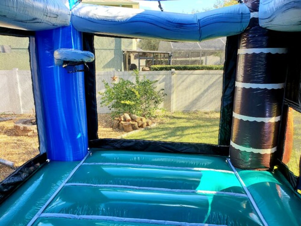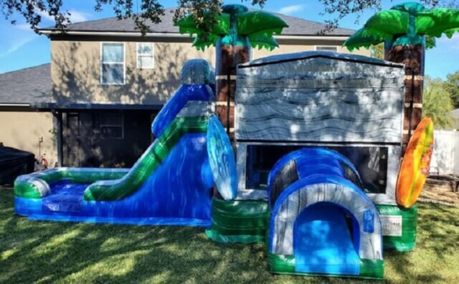 Aloha! This bounce house combo will bring excitement to your home. With tall palm trees swaying in the breeze and surfboards alongside the entrance, it brings back memories of your favorite fun day at the beach. Featuring a bounce house with a basketball hoop inside, a soft sloped climb, and a slide this fun combo is sure to please everyone.