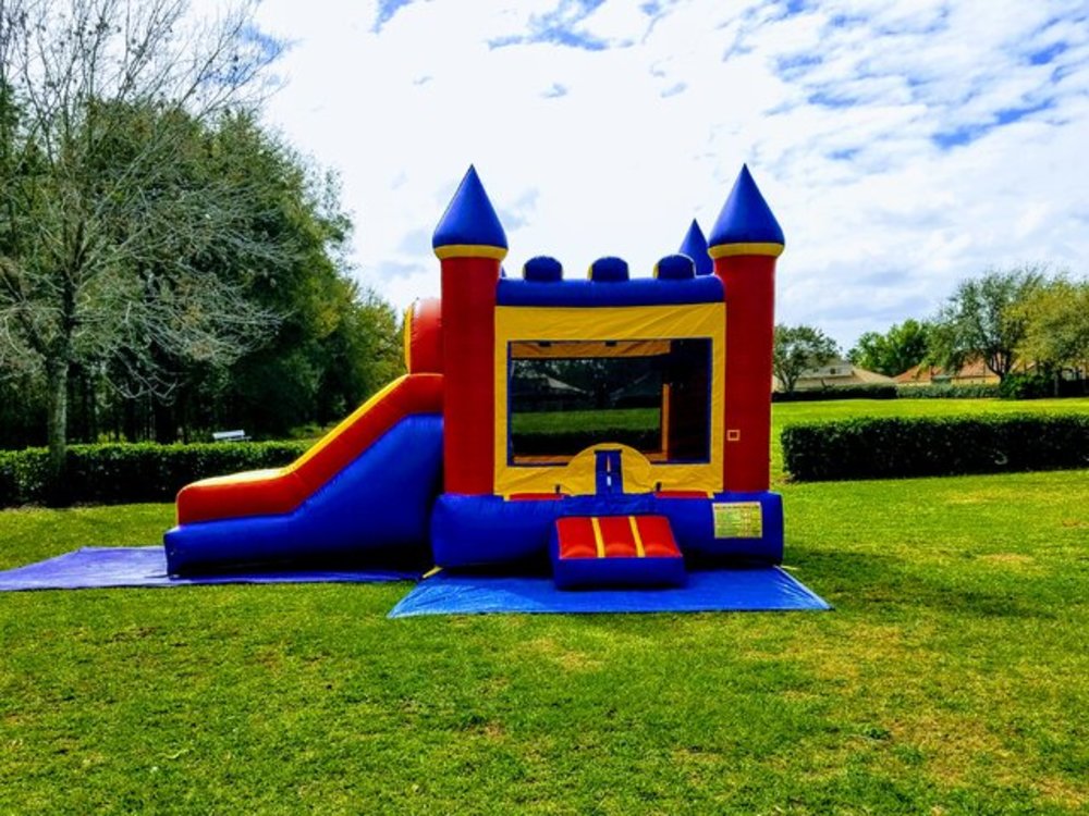This classic Large Castle Combo is the most versatile 4-in-1 combo unit available. It features a 16ft by 16ft bounce house with a basketball hoop inside as a bonus, along with a soft inflatable climb to slide out onto an exciting 10ft slide. The Large Castle's bright colors make it stand out while keeping the classic look that is always a crowd-pleaser!