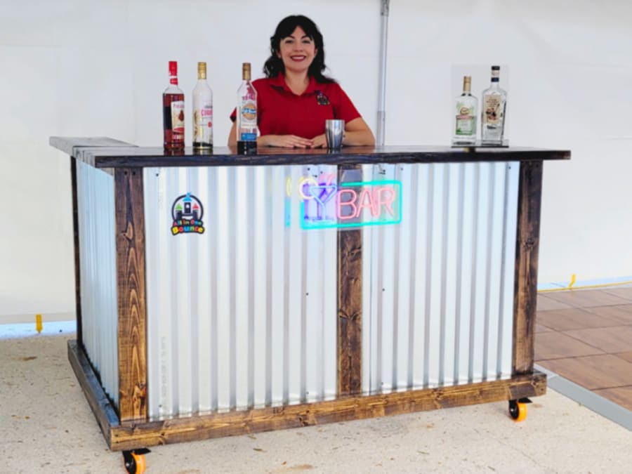 Create an unforgettable bar experience for your guests! Book our L+-Shaped Tiki Bar with Multi-Color LED Bar Sign today and bring a touch of festive elegance to your event in Orlando and Central Florida.