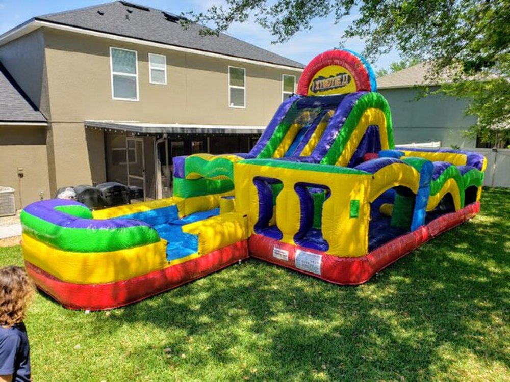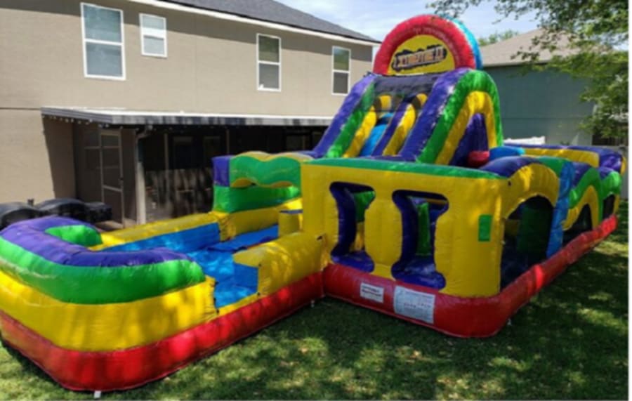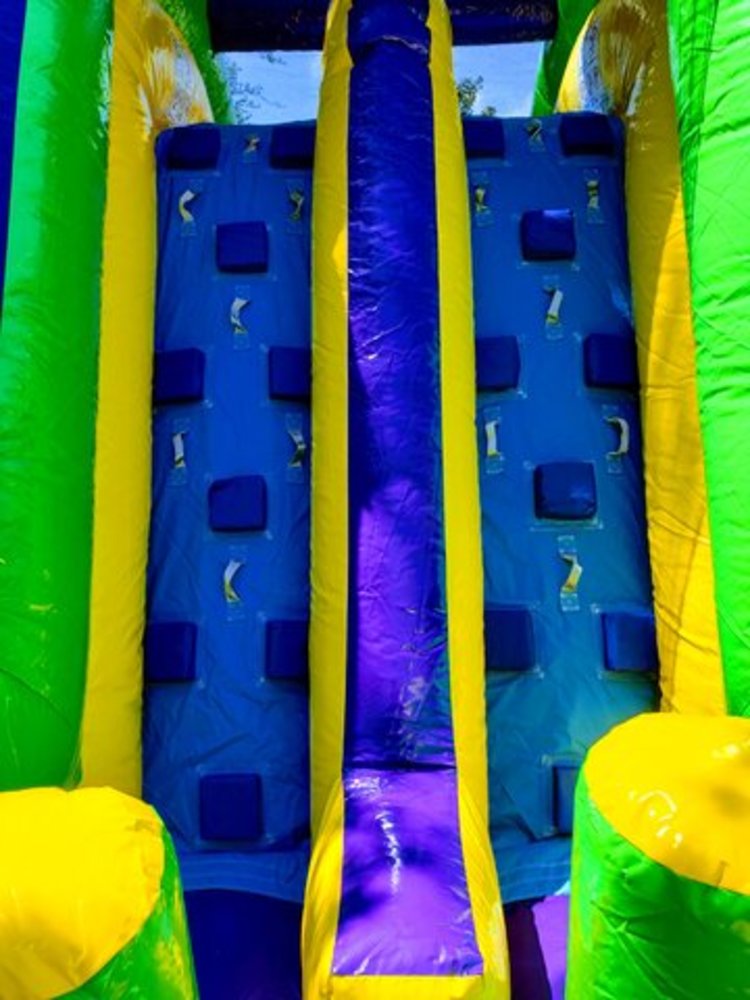 Can be used Wet or Dry. Part of the Extreme obstacle course collection. This course has obstacles after obstacles that take you to a U-turn, and then to the tall soft rock climb. From the climb slide down the exhilarating dual lane water slide to splash into the large pool waiting below. This is a 30ft long obstacle course that has a U-turn connecting to an 18ft tall by 40 ft long dual lane water slide. Have fun and get amazing exercise.