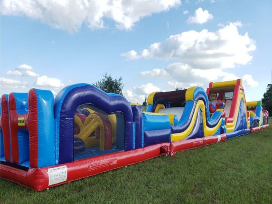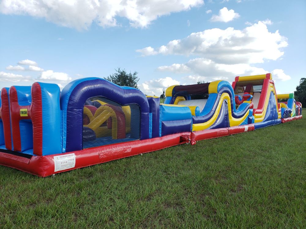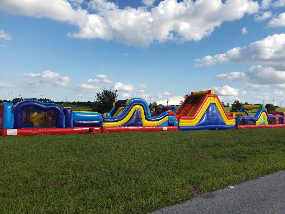 120ft long by 18ft tall by 14ft wide this very daring, dual race lane obstacle course will blow your mind. With a 16ft inflatable rock wall climb and slide, an 8ft climb and slide, and a 6ft climb and slide plus 20 other challenging elements. Get ready to CLIMB, SLIDE, RUN, JUMP, BOUNCE, CRAWL, ROLL your way through and have a blast.
