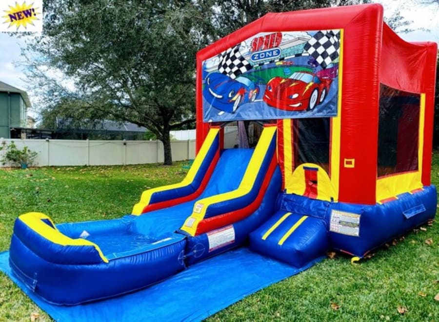 Surprise your racing fans with this fantastic eye-catching Speed Sone-theme bounce house combo. It is a 14ft x 14ft castle with an added climb to get to the 6ft slide and a 5ft wide pool to dip in. The total size is 16ft tall by 14ft wide by 25ft long.