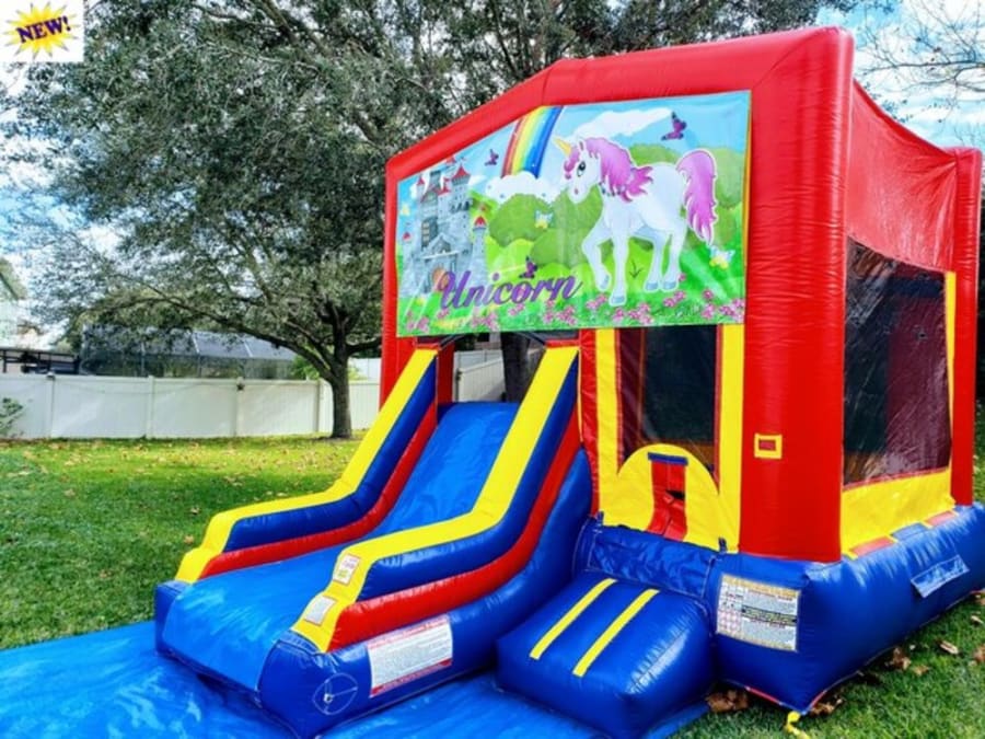Perfect for anyone who loves unicorns. This eye-catching theme is sure to please. It is a 14ft x 14ft castle with an added climb to get to the 6ft slide. The total size is 16ft tall by 14ft wide by 20ft long.