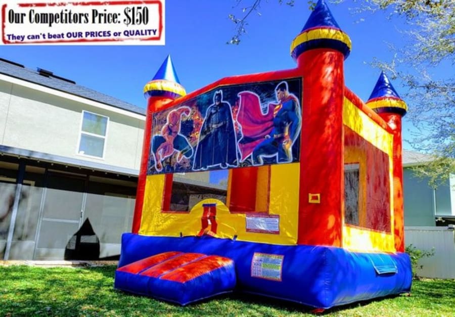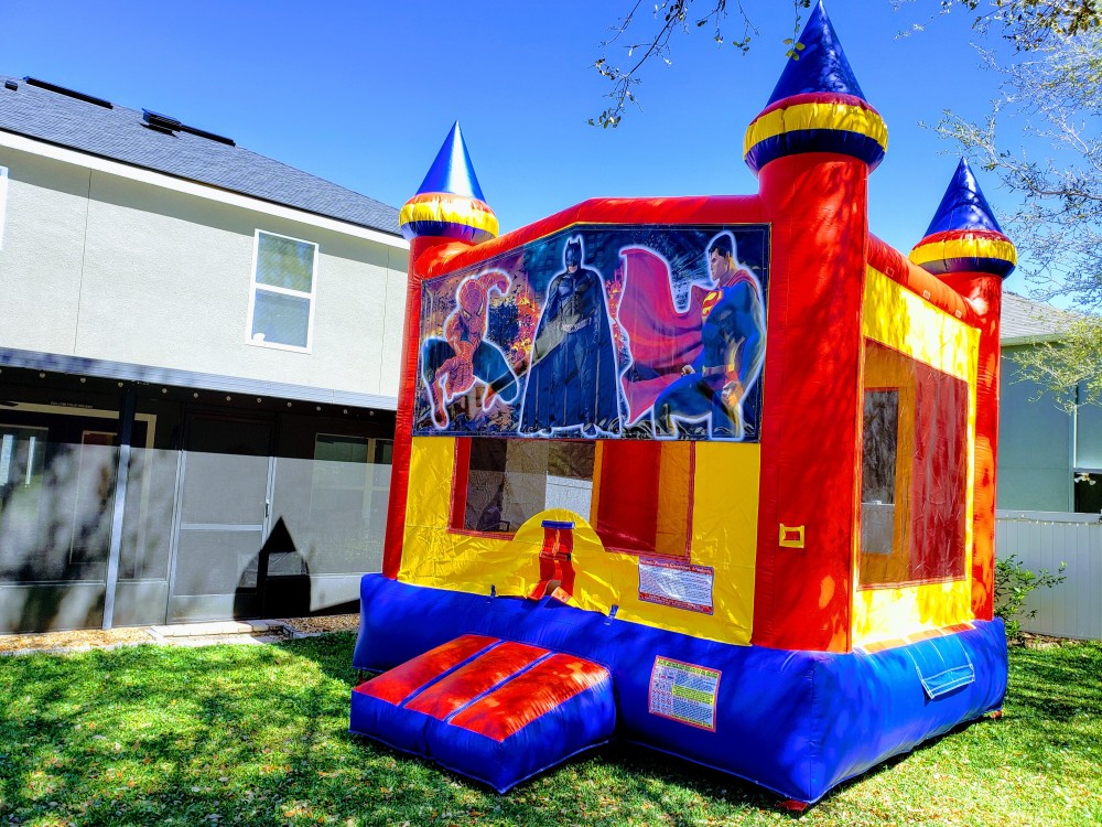 Great for superhero fans everywhere. All 3 big guys are represented, Spider-man, Batman, and Superman. It's a medium size 14 ft X 14 ft castle, a great centerpiece for any event.