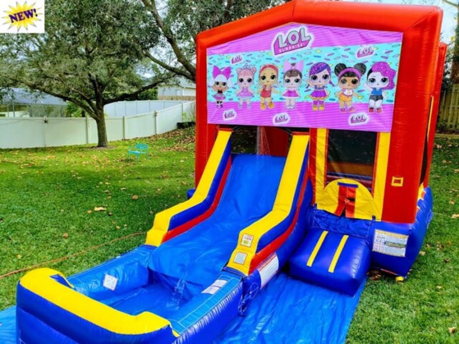 Surprise you little LOL fans with this fantastic LOL Surprise themed combo. This eye-catching theme is sure to please. It is a 14ft x 14ft castle with an added climb to get to the 6ft slide and a 5ft wide pool to dip in. The total size is 16ft tall by 14ft wide by 25ft long.