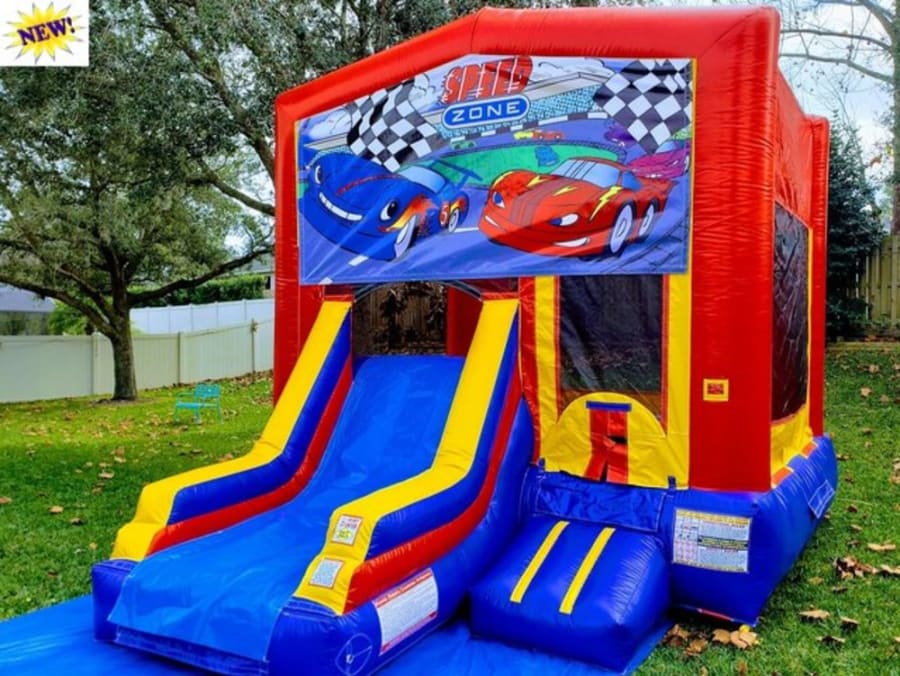 An amazing addition to any celebratory event. Race fans of all ages will love this Speed Zone-themed bounce house combo. It is a 14ft x 14ft castle with an added climb to get to the 6ft slide. The total size is 16ft tall by 14ft wide by 20ft long.