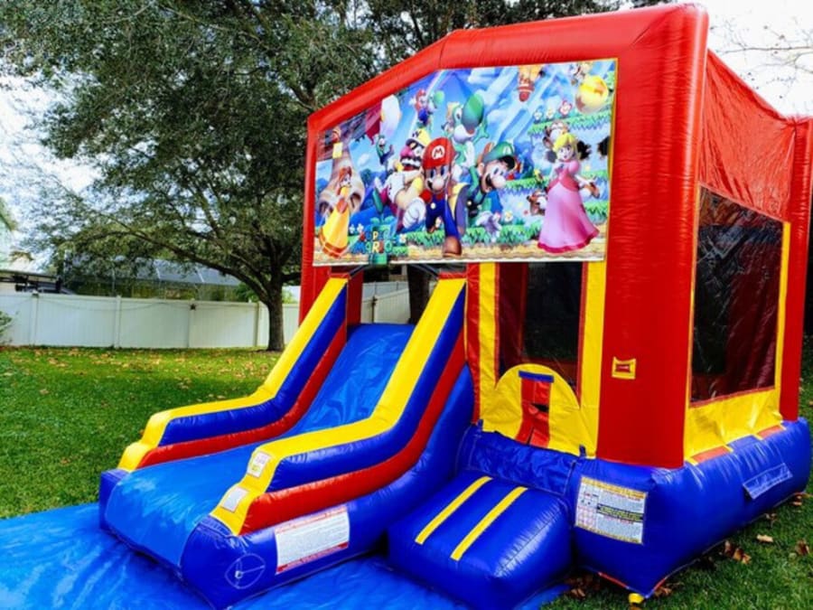 Jump up and get power-ups to defeat Bowser! Let Mario, Luigi, and all their pals join your celebration with this bounce house combo with slide. It is a 14ft x 14ft castle with an added climb to get to the 6ft slide.