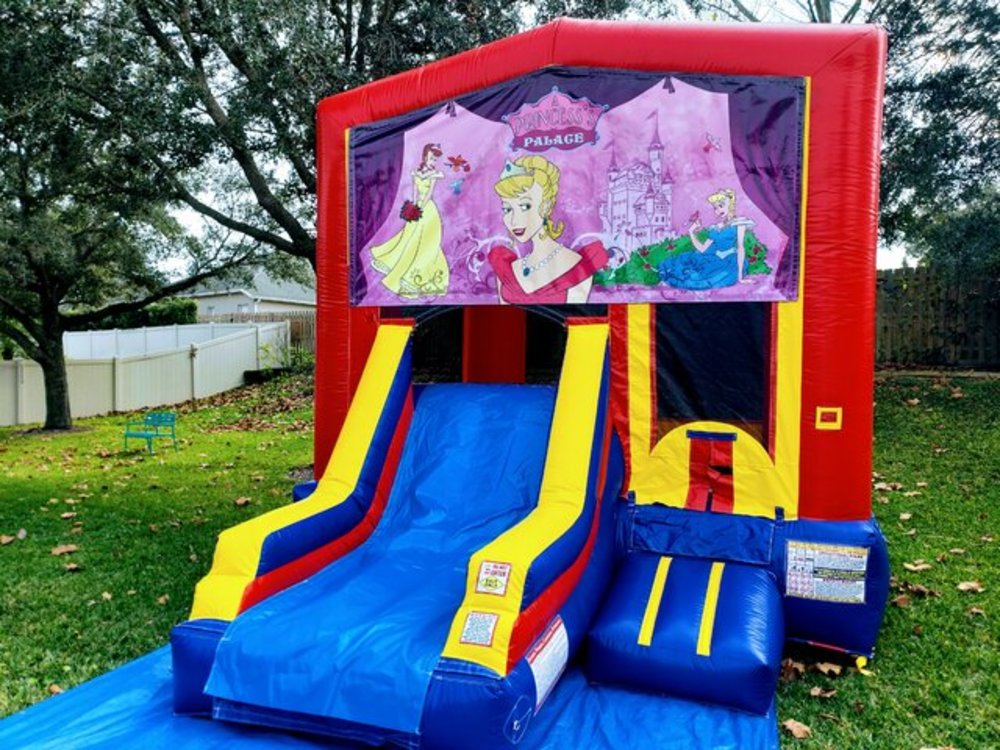 Perfect little princesses. This eye-catching theme is sure to please. It is a 14ft x 14ft castle with an added climb to get to the 6ft slide. The total size is 16ft tall by 14ft wide by 20ft long.