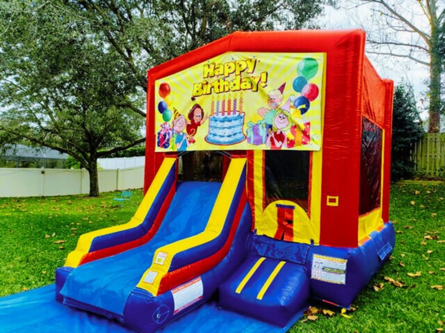 Perfect for your special day. This eye-catching Birthday theme is sure to please. It is a 14ft x 14ft castle with an added climb to get to the 6ft slide. The total size is 16ft tall by 14ft wide by 20ft long.