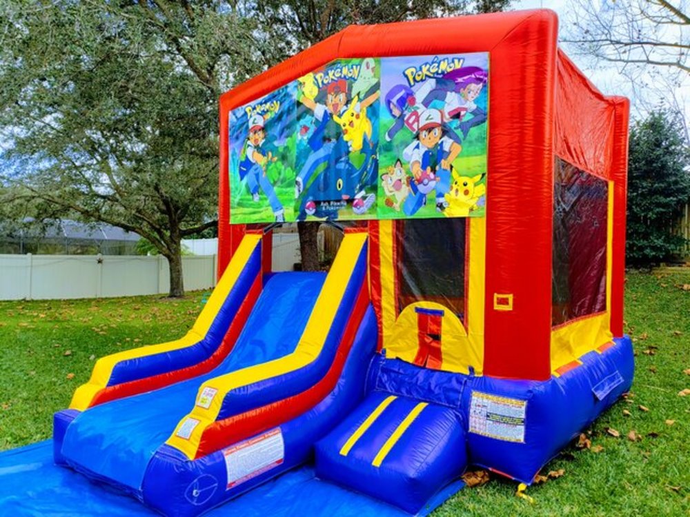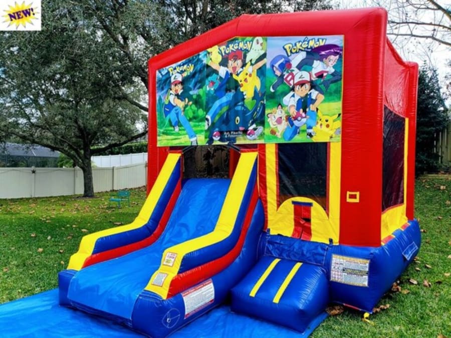 Does your little Pokemon fan wanna catch 'em all? well, then this Bounce house is perfect for you. It is a 14ft x 14ft castle with an added climb to get to the 6ft slide. The total size is 16ft tall by 14ft wide by 20ft long.
