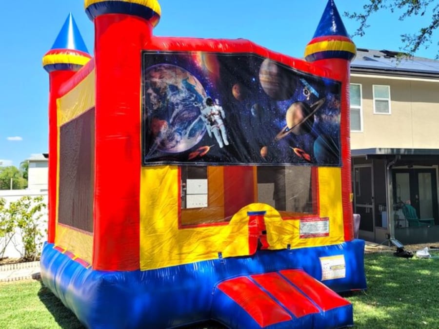 Amazing Space-Themed bounce house. Let your imagination run wild, Blast into space with this medium-sized 14 ft X 14 ft castle, a great centerpiece for any event.