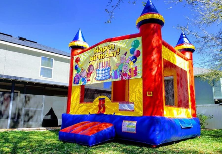 Say HAPPY BIRTHDAY with this classic bounce house, with the most classic message. It's a medium size 14 ft X 14 ft castle, a great centerpiece for any birthday. Neutral colors for boys and girls will love this.