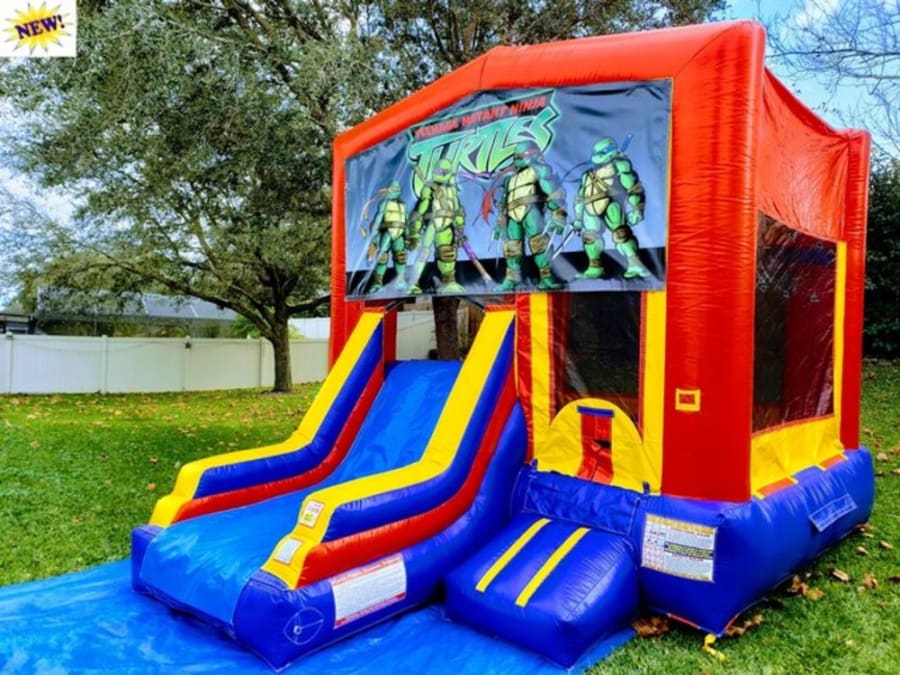 Leap, dodge, and practice your awesome ninja skills along with Raphael, Leonardo, Donatello, and Michelangelo in this Ninja Turtles-themed bounce house combo. It is a 14ft x 14ft castle with an added climb to get to the 6ft slide. The total size is 16ft tall by 14ft wide by 20ft long.