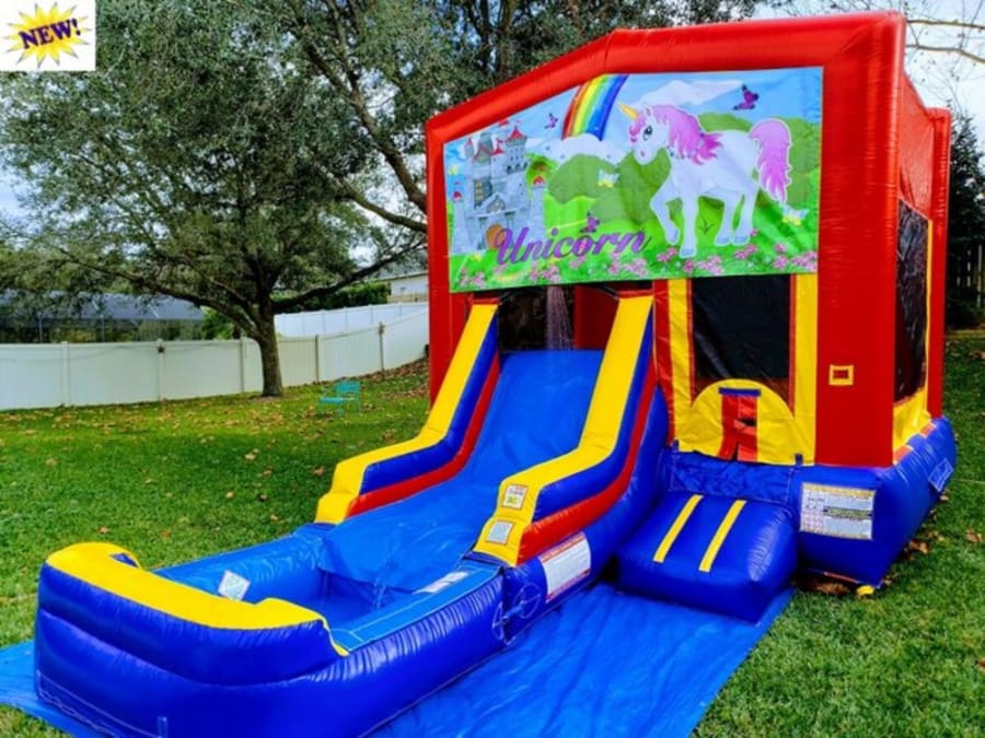 This amazing Bounce house with pool combo is perfect for anyone who loves unicorns. It is a 14ft x 14ft castle with an added climb to get to the 6ft slide and a 5ft wide pool to dip in. The total size is 16ft tall by 14ft wide by 25ft long.