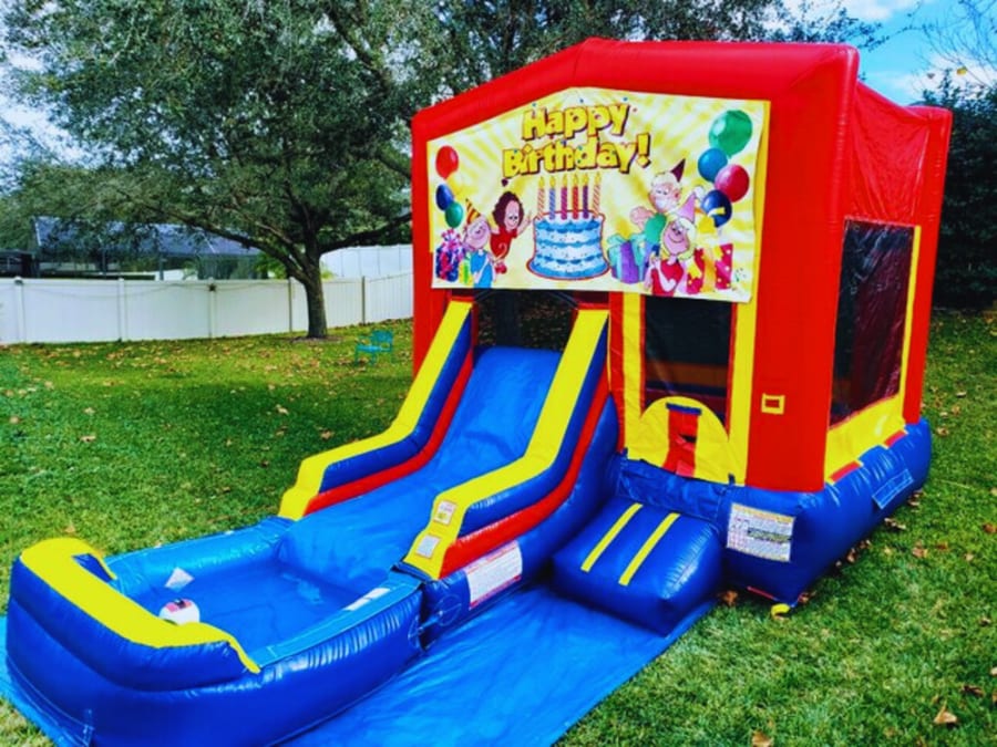 Say HAPPY BIRTHDAY with this beautiful bounce climb and slide combo. It is a 14ft x 14ft castle with an added climb to get to the 6ft slide, and a 5ft pool to dip in.