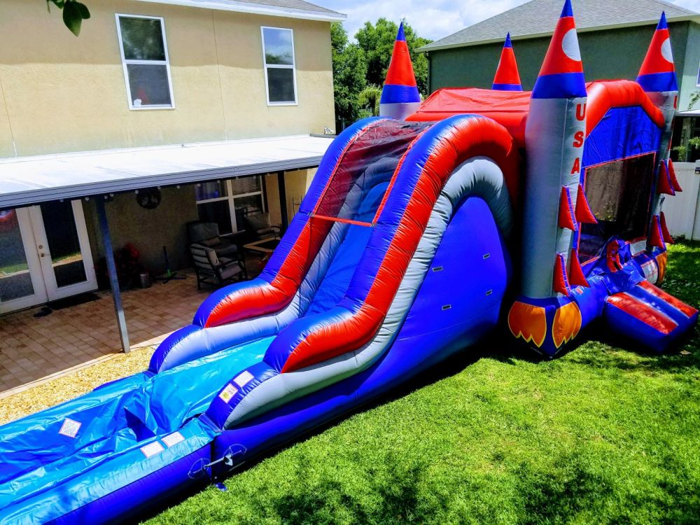 Get ready for an out-of-this-world adventure with the vibrant Patriotic Rockets bounce house and slide combo. Designed in bold patriotic colors of red, silver, and blue, this eye-catching unit features flame graphics at its base and towering inflatable rockets at each corner. The spacious bounce area includes mesh panels for ventilation, while the single-lane wet/dry slide is covered by a mesh canopy for added shade and protection. The slide ends in a refreshing oval splash pool, perfect for cooling off during sunny events. With its high side bumpers for extra safety, this combo is a fantastic choice for backyard parties, family celebrations, and outdoor festivals.