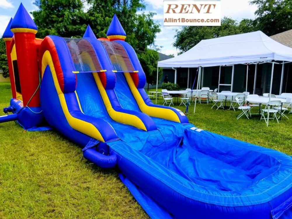Unleash your competitive drive and slide side-by-side into splashing water landing with the Double Dip dual lane slide and bounce house combo when you add the refreshing 6 ft wide shallow wading pool. This COLOSSAL wet and dry combo will bring a blast to your event. Everyone can enjoy it, kids and adults. Sit around the shallow pool with your feet in while the kids have a blast. Great for all sizes, especially large events.