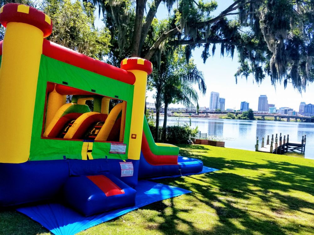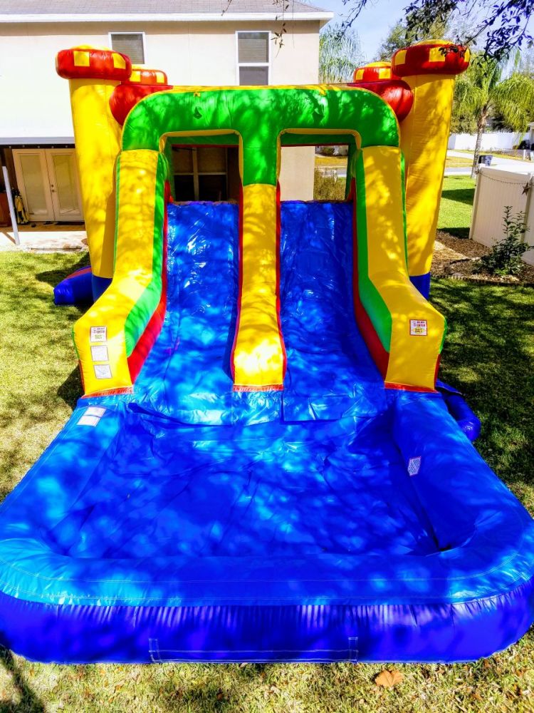 Let the fun begin with... side-by-side slide into one of the widest inflatable pools ever put on a bounce house combo. This COLOSSAL wet and dry combo will bring a blast to your event. Everyone can enjoy it, kids and adults. Sit around the wide, shallow pool with your feet in while the kids have a blast. Great for all sizes, especially large events.