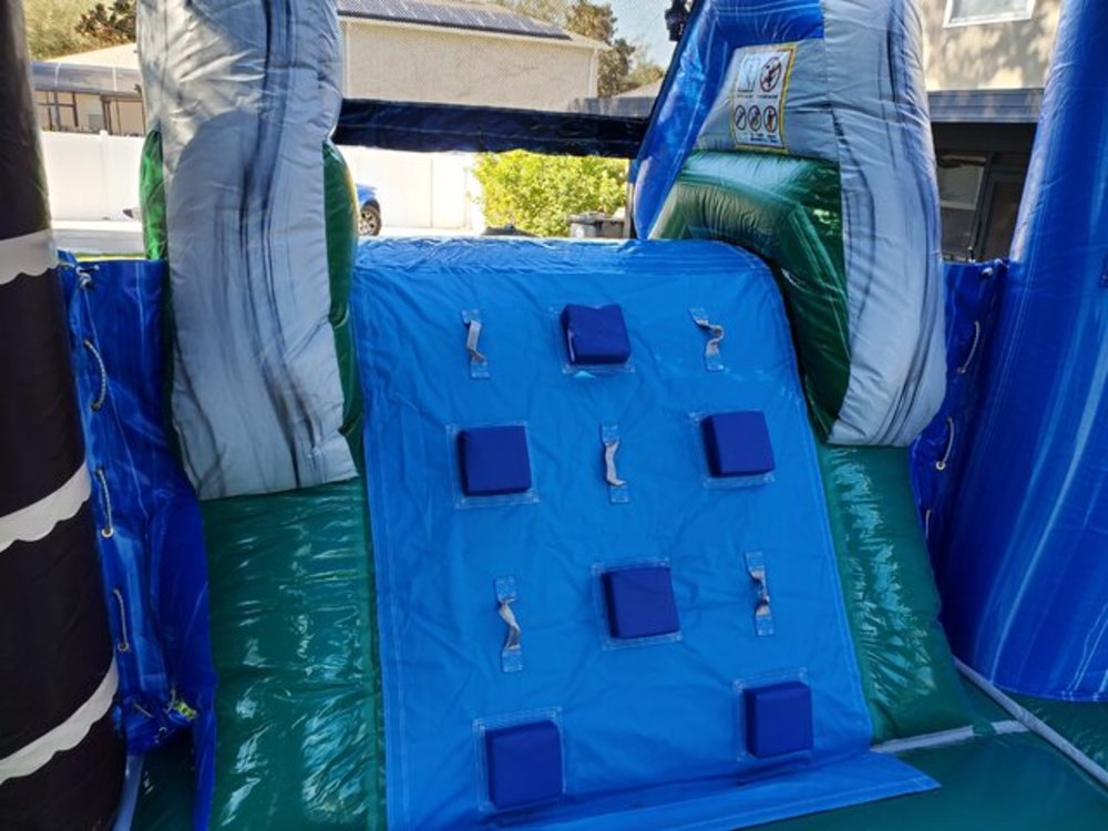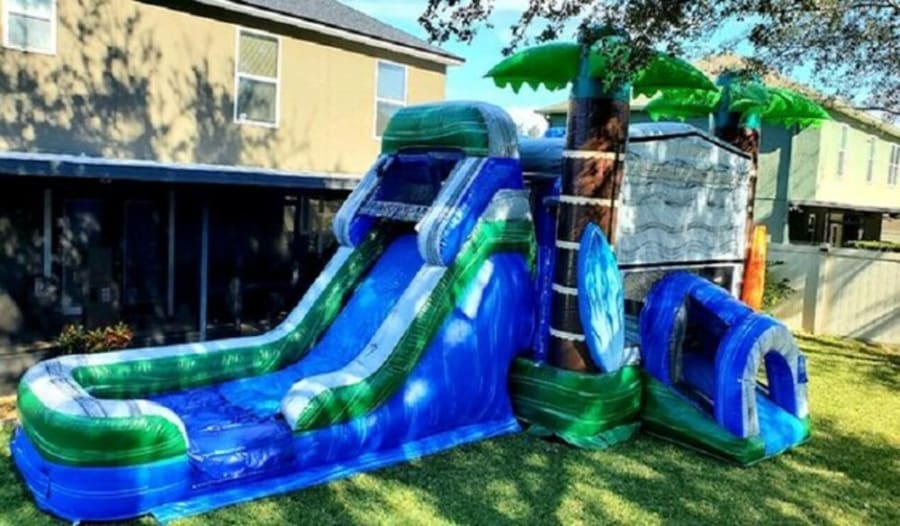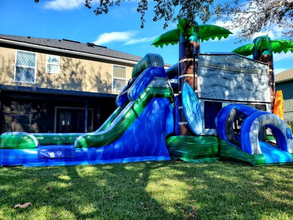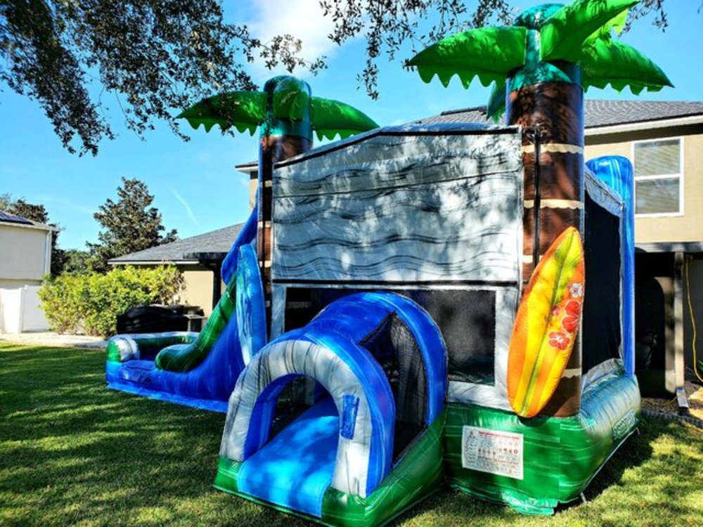 Aloha! This bounce house combo will bring excitement to your home. With tall palm trees swaying in the breeze, and surfboards alongside the entrance, it brings back memories of your favorite fun day at the beach. Featuring a bounce house with a basketball hoop inside, a soft sloped climb, and a slide this fun combo is sure to please everyone.