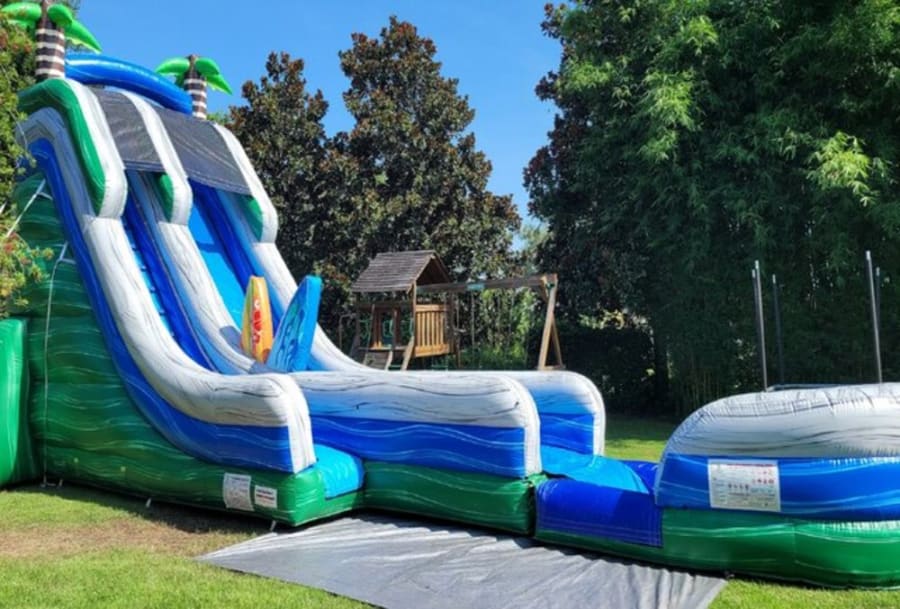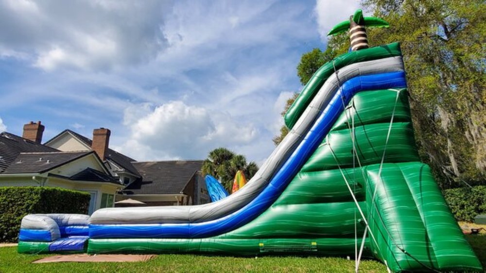 This thrilling water slide is themed with colorful palm trees and surfboards to bring tropical paradise and Hawaiian Surf vibes to your event. It will be the spotlight of your event and is perfect to complement any occasion. This GIANT 25 feet tall by 18 ft wide by 48 feet long water slide is great for all ages, including adults, and for any party type: water day, fundraisers, birthdays, family reunions, backyard parties, block parties, church or school festivals, etc.