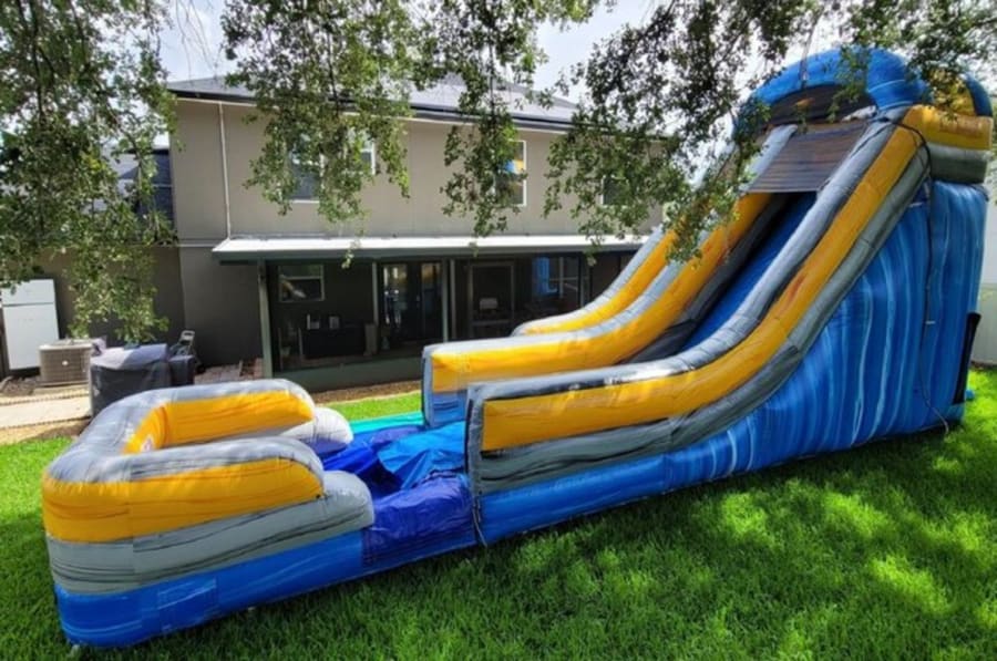 Feel the rush of the Tsunami water slide! Climb up to the top of the 20-foot high steps, then let the water rush over you as you splash onto the bottom bumper and huge pool. The Tsunami water slide is large enough to delight guests of any age and party type. Water day, fundraisers, birthdays, family reunions, school or church festivals, etc.